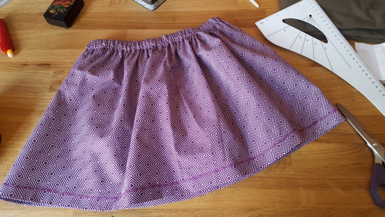 Werd ook gemaakt: een rokje voor nichtje Vif. Ik beloofde haar een rokje met paarse stof (haar lievelingskleur, ik kan me er helemaal in vinden) tegen dat ze op vakantie gingen. Missie geslaagd: ik vond mooie paarse stof bij de Modecoupon, het rokje was snel en eenvoudig in elkaar gezet (afmeten, stof aan elkaar naaien, tunneltje maken en rekker erin, zoom), het rokje werd net op tijd afgegeven, en Vifje en ik zijn blij.