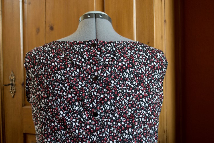Ik nam weer als basis het Butterick B5812 jurkje, maar ik keerde terug naar versie B, zonder aangeknipte mouwen. Ik haalde er het eerdere kleedje bij waarvan ik zeer tevreden was, en baseerde me daarop voor eventuele aanpassingen van het patroon. Het rugpand knipte ik in 2 stukken (zoals voorzien in het patroon), het achterpand van het rokdeel in 1 stuk. Ik werkte overal af met een simpele zoom (geen geklooi met beleg of voering deze keer, ik had er geen zin meer in), en zette kamsnapjes op de sluiting van de rug.