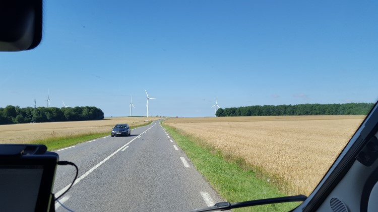 Luxemburg is bij momenten prachtig. Wat zijn we blij dat we de kleinere wegen nemen, we zien ongelooflijk veel mooie landschappen. Langzaamaan klaart het weer uit, we rijden duidelijk naar de zon. Ons cash geld was een beetje op, we zoeken en vinden een Bancontact. Onze voorraad eten begint ook te minderen, en in Virton doen we boodschappen in een AD Delhaize. We proppen onze koelkast vol, eten een slaatje en gaan weer op pad. In de buurt van Longwy (aankomstplaats van gisteren) steken we de grens over en rijden meteen tussen glooiende graanvelden.