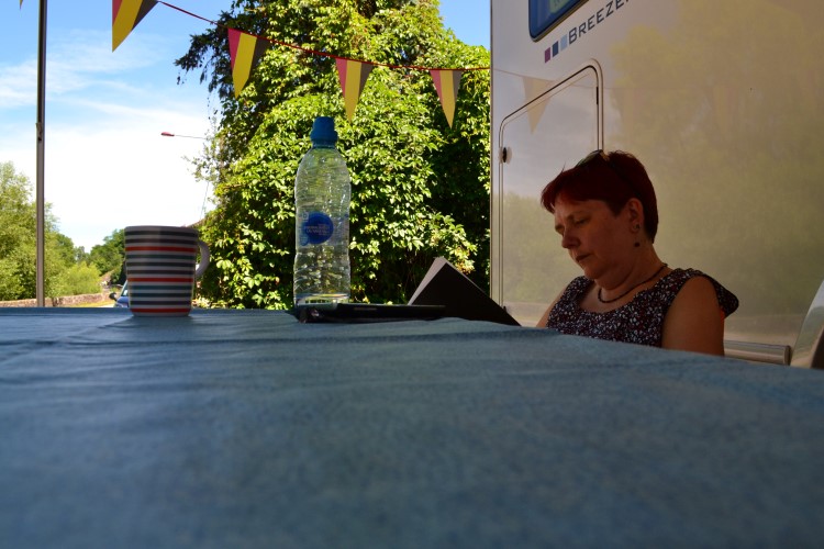 We hebben heel veel lol samen, we genieten enorm van het rijden, de landschappen, de wolken. We zijn ondertussen weer een goed op elkaar ingespeeld team van piloot en co-piloot. We hebben eens te meer wegen gekozen waar vaak geen kat te zien is, en rijden door het hol van pluto van Frankrijk (Frankrijk heeft er zo veel). Wat is het mooi. We rijden hele stukken langs de Maas (slanke versie), rijden door de Lorraine, en belanden in de Vogezen. We stoppen voor een tas koffie, we stoppen voor een boterham. Onderweg beslissen we niet te zot ver te rijden, een goeie 20 km voorbij startplaats van morgen Vittel. Daar zoeken we dan een camperplaats. Het rijden naar de camperplaats loopt een beetje fout, we rijden een 30-tal kilometer rond. Maar uiteindelijk vinden we waar we zijn moeten, een camperplaats op de Marina in Corre. Opnieuw is er nog veel plaats. Camperplaatsen met water en elektriciteit, en we kunnen ook douchen als we willen in een zeer nette douche. De omgeving is mooi, we zitten op het domein van de jachthaven van Corre aan de Saône.