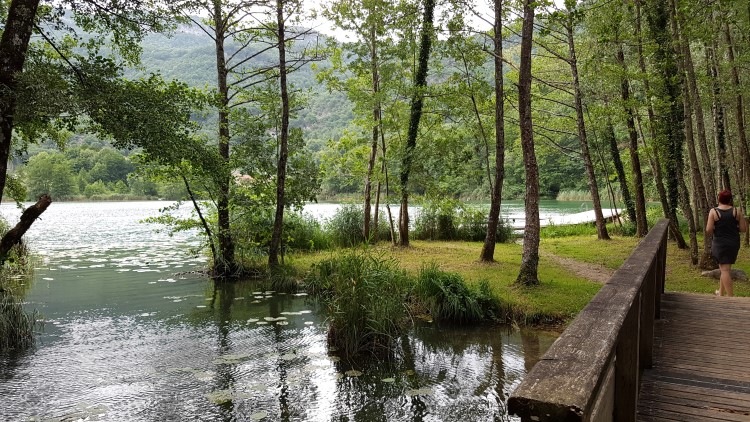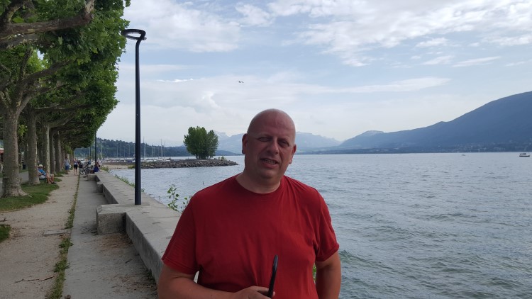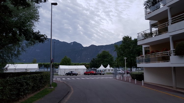 Ik had al last van gezwollen vingers bij warmte, maar gezwollen voeten, dat is nieuw, en ik kan er niet echt mee lachen. Ik voel me gelijk een dikke, ouwe meet. We wandelen nog even naar het meer, dat op 200 meter of zo van onze deur ligt. Overal staan hekkens, later zoeken we op waarom: volgende week is er een groot muziekfestival in Aix-les-Bains.