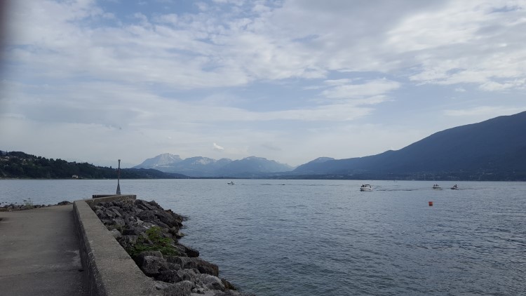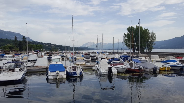Rond 8u30 zoeken we een apotheek en een supermarkt voor de boodschappen. Ook dat gaat vlot, en rond 10u zijn we terug op weg met een koelkast vol lekkers en een bergruimte met plenty aan water, want het blijft heet. Om 10u is het al 28 graden. Ik denk dat we eventueel Annecy gaan passeren en dan het parcours van de Tour gaan opdraaien, maar dat denk ik fout. We rijden tussen het Lac d’Annecy en het Lac du Bourget in, en beklimmen dan een serieuze berg. Ergens onderweg bekruipt me de twijfel dat we daarboven een goede camperplaats zullen vinden. En die twijfel blijkt gegrond: boven zijn wel wat faciliteiten voor campers, maar die krijgen we niet aan de praat. De zon schijnt ook genadeloos op de camperplek, en we besluiten terug naar beneden te rijden en elders iets te zoeken dat ons meer geschikt lijkt. Via de camper-app vind ik een camperplaats aan le Lac du Bourget. Er binnenraken lukt niet echt vlotjes, maar toch zonder brokken.