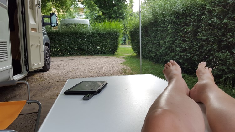 Ondertussen zorgt Meneertje Mertens dat we internet hebben en kijk, er is Wi-Fi! Ik kan mijn blog bijwerken! Na de koers installeren we ons gelijk de echte voor onze camper. Ik merk opeens op hoe gezwollen mijn voeten zijn, ik schrik ervan.