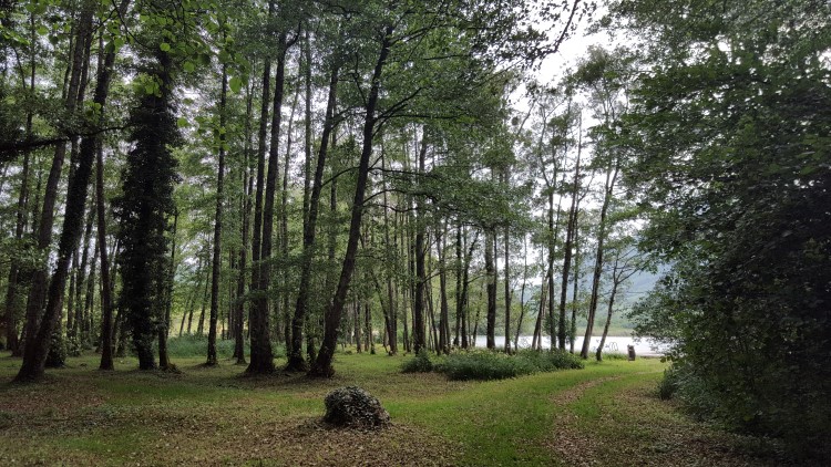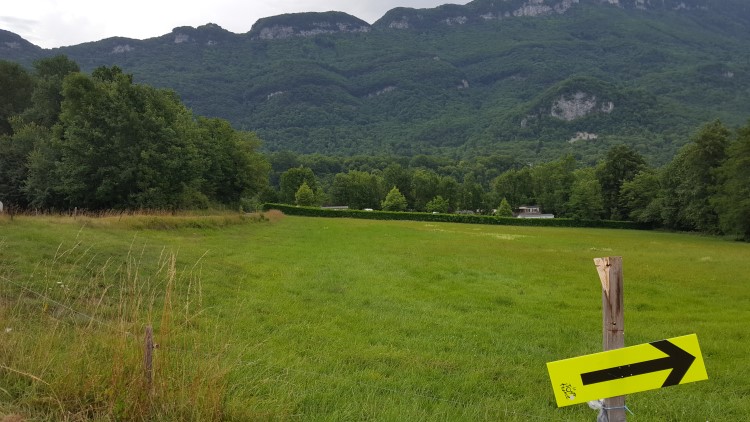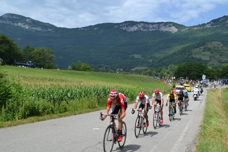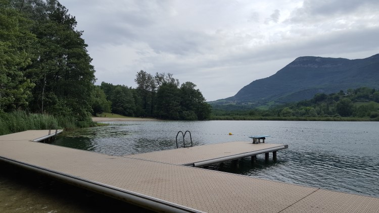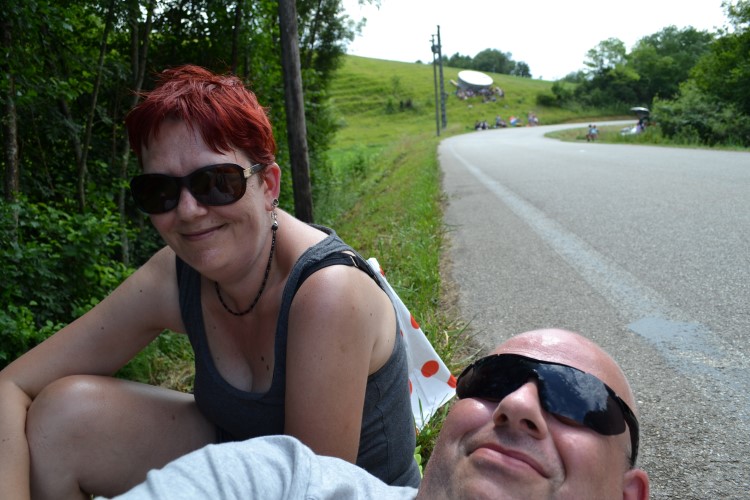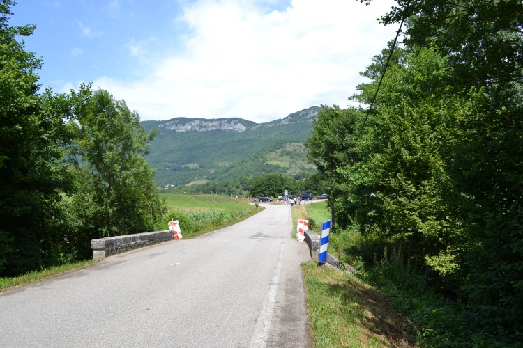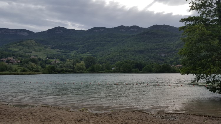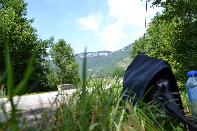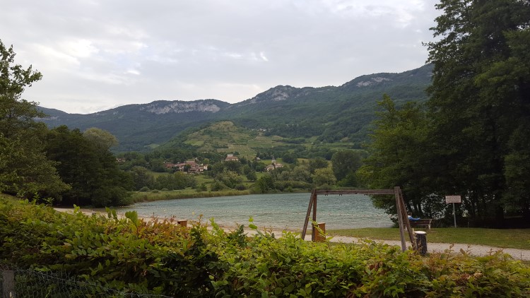 Onze buren ergeren zich wellicht te pletter: waarom moeten die 2 oenen van Belgen om 4u opstaan om pas om 6u te vertrekken? Tja, zo zijn we nu eenmaal. Opruimen, beetje wassen, ontbijt… het duurt wel even. We proberen het lawaai te beperken. Rond 6u rijden we zonder ongelukken met de bareel naar buiten, en vertrekken we richting Saint-Jean-de-Chevelu. Het is niet ver, we gaan veel te vroeg zijn. We krijgen nog een klein omleidingske voorgeschoteld (er wordt gewerkt aan de Tunnel du Chat, maar ondanks omleiding en stevige berg (die de renners deze namiddag gaan beklimmen, de Mont du Chat) staan we rond 7u in de buurt van de camping. We eten nog een hapje, gaan alvast eens op verkenning, wat is het hier mooi zeg!