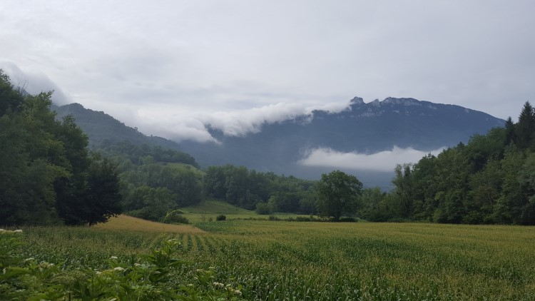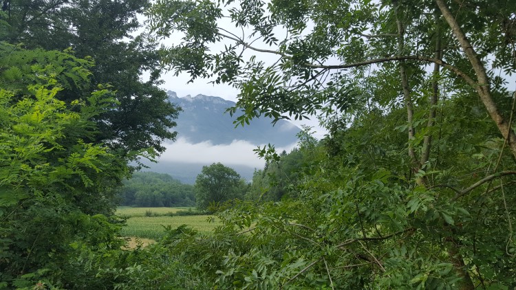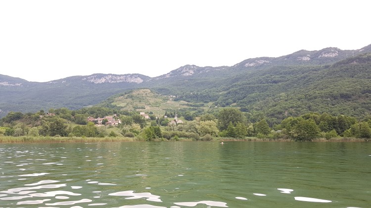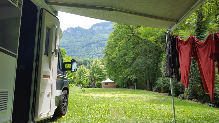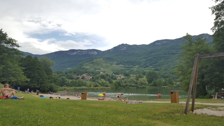 Daarna besluit Meneertje Mertens toch naar Yenne te fietsen (ik rijd niet mee, dr. Balliu heeft me verordoneerd om op mijn gat voor de camper te zitten dus doe ik dat zo ongeveer toch) om geld af te halen in de bancontact aldaar. Want ik had domweg ons laatste cash geld gebruikt om de camping te betalen. Oeps. Ondertussen maak ik eten, fruitsla en thee. (en help en passant den elektriek om zeep door de waterkoker 2 keer na elkaar te gebruiken?! Onze kabel was te kort en we hebben er een verlengkabel aan gehangen, daar knelde het schoentje). Meneertje Mertens keert onverrichterzake terug uit Yenne: het geld in de bancontact is op. Tja. Geen centen dus. Een kabel gaan lenen bij de mensen van de receptie, gelukkig mogen we hem gebruiken zonder de gebruikelijke waarborg te betalen. We probeerden al een paar keer te videochatten met Janna, maar lopen elkaar telkens jammerlijk mis. We gaan zwemmen in het meer bij de camping, wat is dat zalig zeg! Vlakbij, redelijk rustig om te zitten, het water is niet te koud, het uitzicht is gewoonweg fantastisch. Wat een prachtige omgeving!