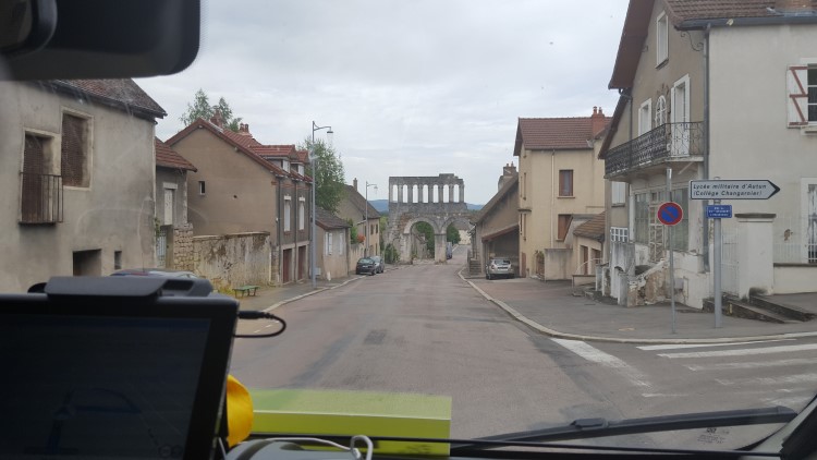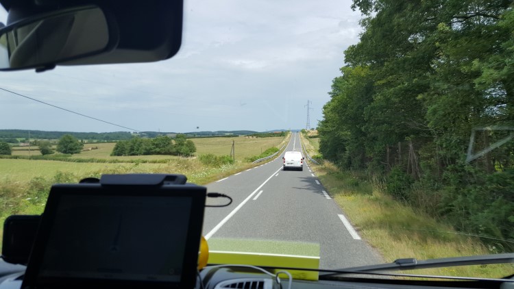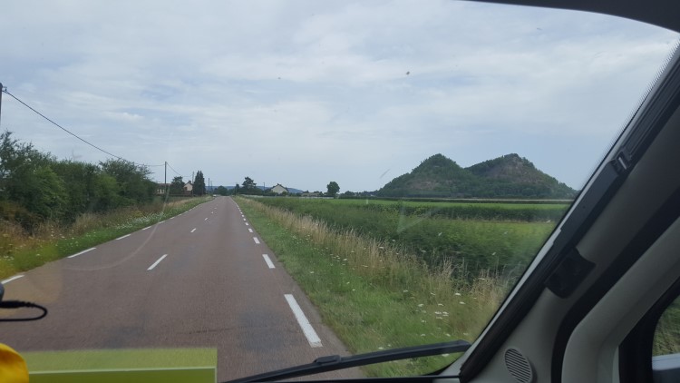 We sukkelen rond 6u30 uit ons bed, Meneertje Mertens dan wel die nog even gaat douchen en koffie maakt, ik wat later, ik geraak niet meer zo enthousiast uit mijn bed. Ik krijg elke dag een kop koffie op bed geserveerd, en dat is wel goed voor het ochtendhumeur. De laatste dingen worden opgeruimd, tegen 8u15 gaan we tanks legen en vullen, het is al aanschuiven. Ik doe ondertussen nog een praatje met onze lieve Nederlandse vrienden, we nemen afscheid, ik ga ons bestelde brood en croissants halen en weg zijn we. We hebben eerst als tussenpunt Troyes ingesteld, zodat we zéker niet in de buurt van Parijs belanden, want daar heeft geen van ons beiden zin in. Het wordt een rit waarover weinig te vertellen valt: we komen geen noemenswaardige dingen tegen, we rijden bij momenten wel door erg mooi landschap, we rijden ons eens vast in Vichy maar dat is snel opgelost, we rijden door La Chaise Dieu wat we erg grappig vinden, we worden voorbijgestoken door een dolle Aldi-vrachtwagen wat we minder grappig vinden (voorbijgestoken worden door een truck met oplegger op een 2-vaksbaan? Not funny indeed), maar meer weet ik niet te bedenken. We stoppen af en toe voor een hapje en een plasje, maar vorderen heel erg goed. De golvende wegen laten zich niet zo goed fotograferen als ik wel zou willen.