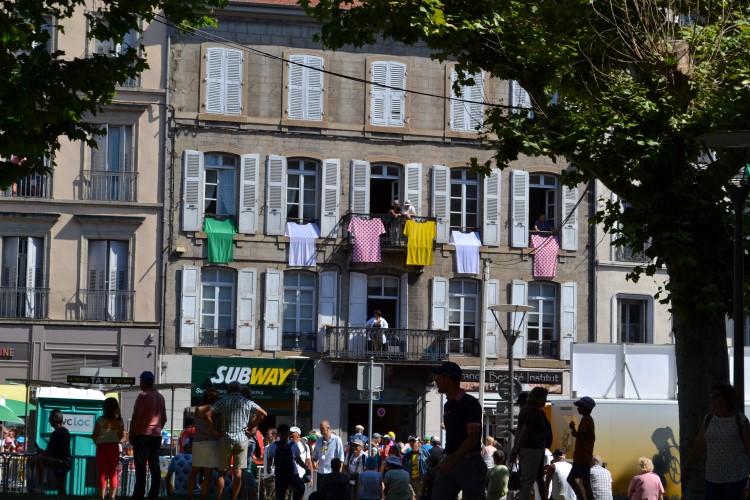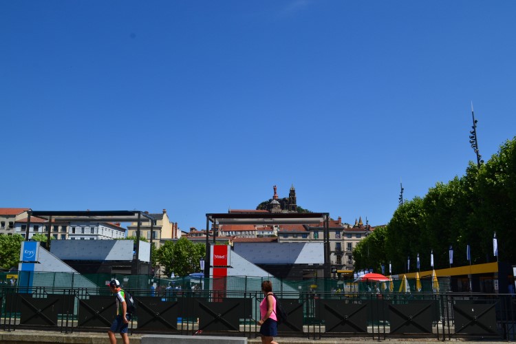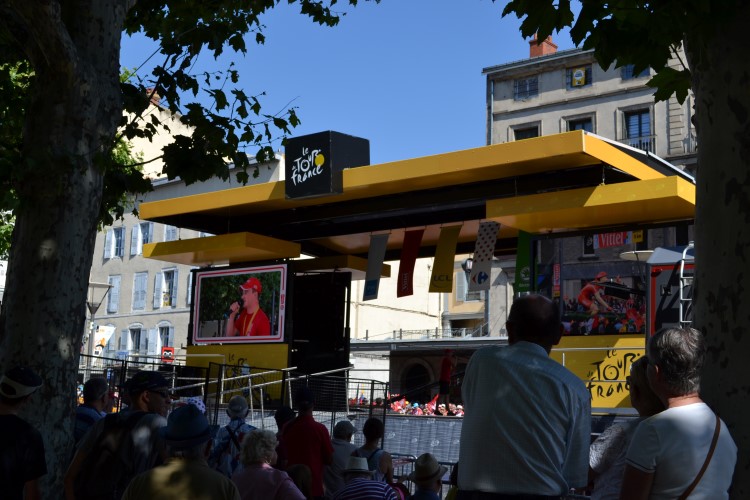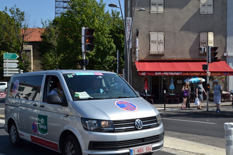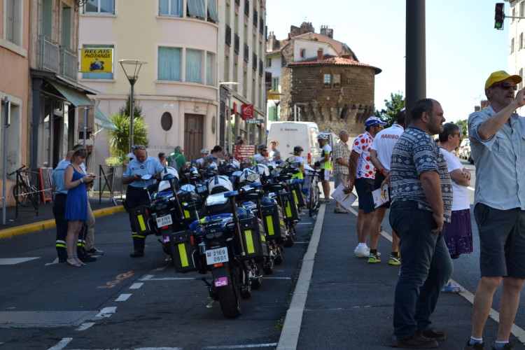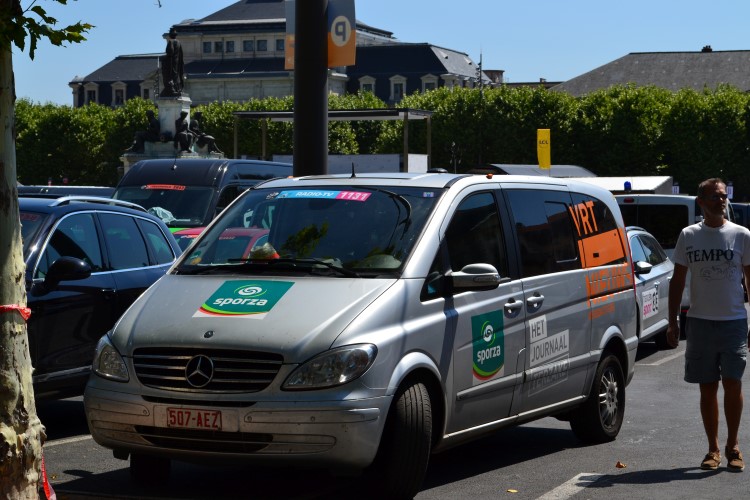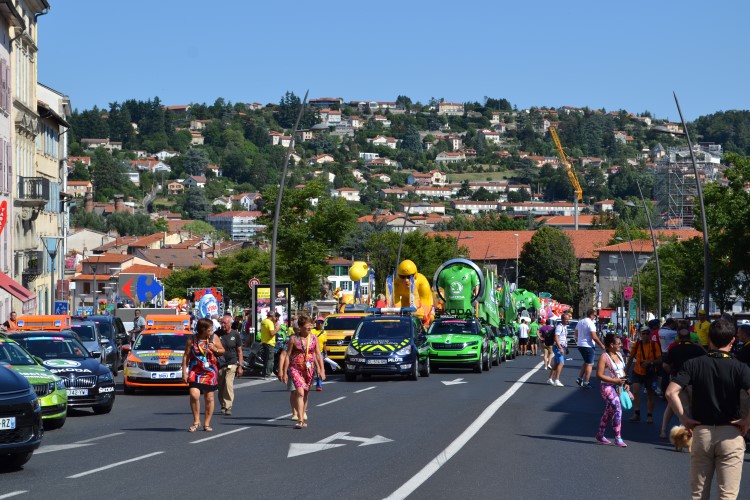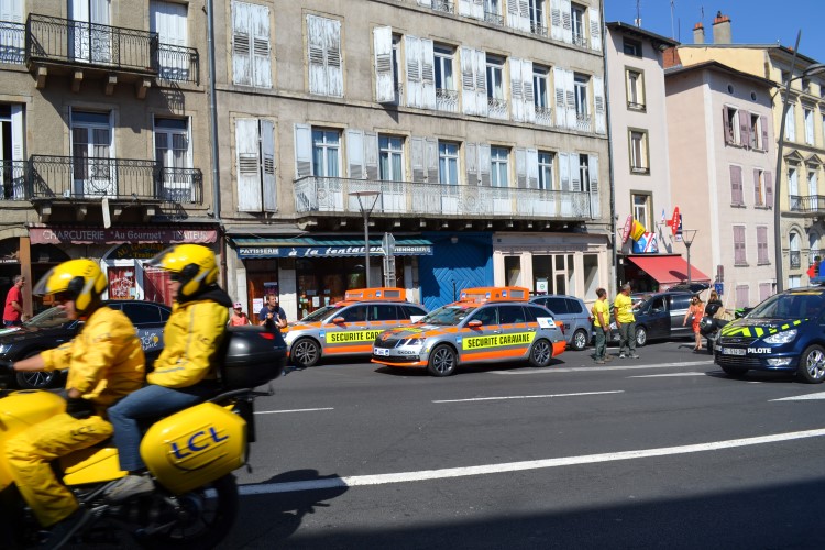 Het goede slapen lijkt een beetje voorbij te zijn. Ik word wakker van mijn gewoonlijke onrustige dromen en ook van muziek die op de camping weerklinkt. Heel raar: klassieke muziek, niet echt zo luid dat het iedereen zal ambeteren, maar net luid genoeg voor mij om er wakker van te worden en te blijven. Geen idee van waar het komt. Tegen de ochtend aan lukt het slapen natuurlijk wel. Vandaag gaan we eens naar de start van een Tour-rit. Zo hebben we dat ook eens gezien. We maken ons op het gemakje klaar: ontbijten, wat rondpotteren, eens naar de ontspanningsruimte naast de receptie om nog een verslag online te zetten (zal morgen op mijn blog verschijnen), het internet hier is allesbehalve, en het Orange-abonnementje dat Meneertje Mertens nam, brengt ook al weinig soelaas: dat werkt meer niet dan wel. Tegen 10u30 vertrekken we naar het centrum, gewapend met flesjes water, zonnecrème en het fototoestel. Het belooft weer warm te worden vandaag. Op het grote plein waar we al eerder waren, staat de publiciteitskaravaan klaar om te vertrekken. Indrukwekkend, zoveel auto’s, en alles heel mooi op volgorde: iedereen moet z’n plekje toch wel goed kennen en weten hoe er te geraken. Geordende chaos.