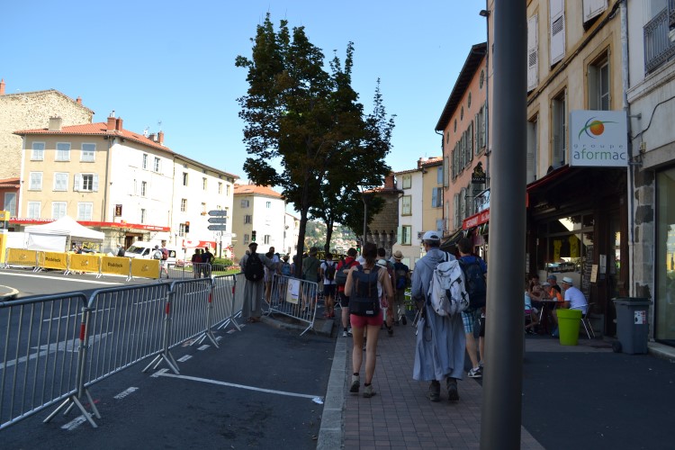 Daarna gaan we op zoek naar het startdorp. Eerst zitten we nog even verkeerd, maar dan vinden we onze weg. We passeren een stel vertrekkende pelgrims (Le Puy is het startpunt van de pelgrimstocht naar Santiago de Compostella, en of de stad nu op zijn kop staat of niet, er blijven altijd mensen vertrekken op tocht).