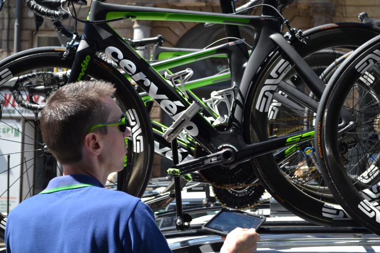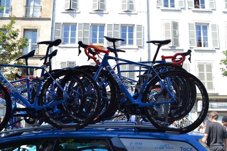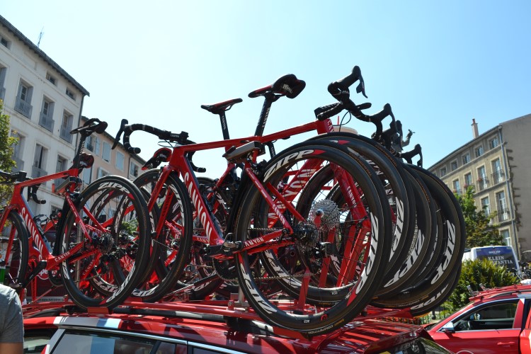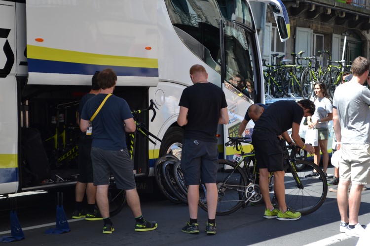 We trekken weer weg, naar de plek waar we vermoeden dat de ploegenbussen zullen staan. En daar staan ze inderdaad ook. We slenteren er langs, kijken mooie bussen en heel, héél veel fietsen.