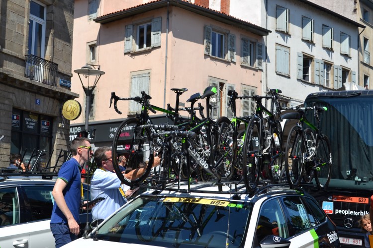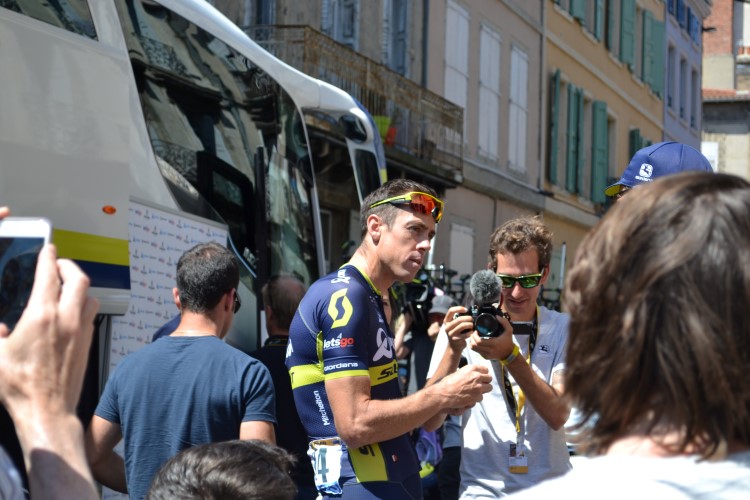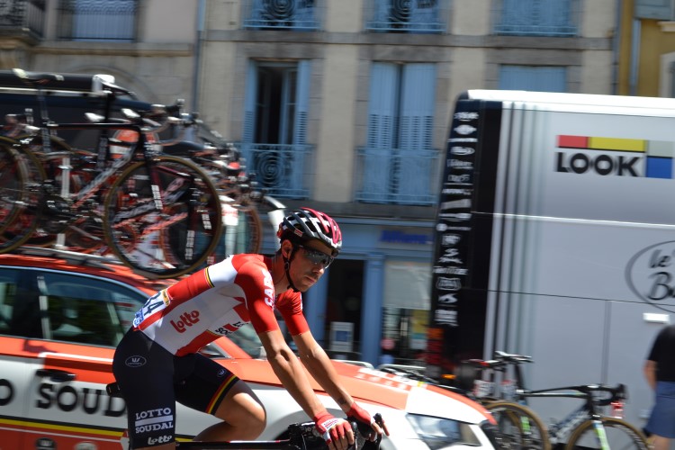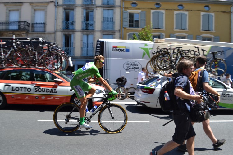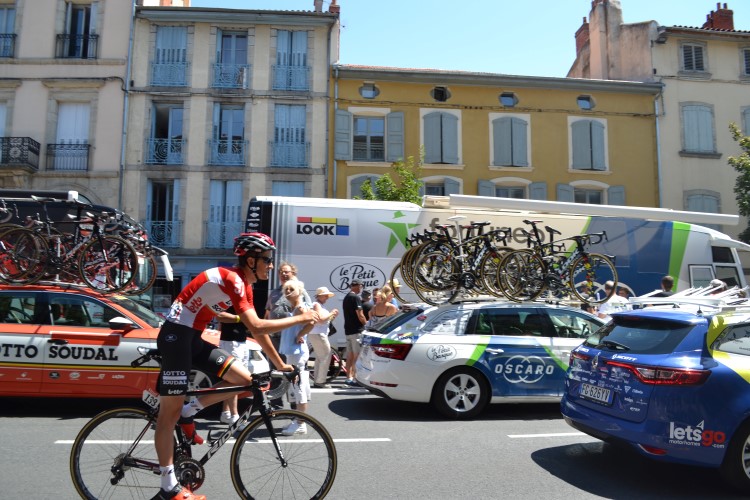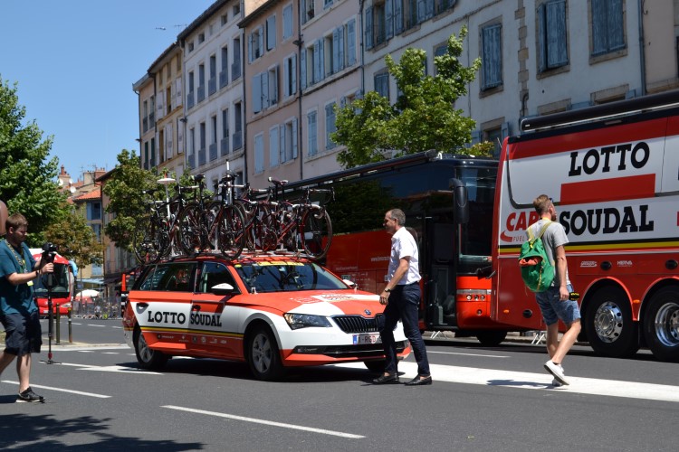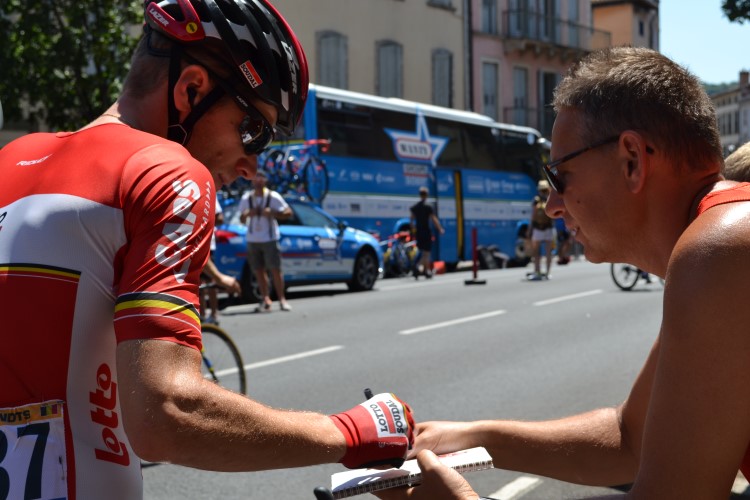 We hadden afgesproken met onze nieuwe Nederlandse vrienden, maar we vinden elkaar niet terug. Tot 10 minuten later, dan lopen we elkaar gewoon tegen het lijf. Dat gebeurt wel vaker hier, blijkbaar. Miljoenen mensen komen naar de Tour kijken, maar je loopt elkaar gewoon verschillende keren tegen het lijf. Want dat gebeurt later ook nog: we verliezen elkaar uit het oog aan de bussen van Sunweb en Orica, maar vinden elkaar daarna gewoon terug. We gaan aan de nadars staan naast een koppel dat Vlaams blijkt te zijn en (dat zien we achteraf) op 10 meter van ons op de camping blijkt te staan. Zij hebben schriftjes met foto’s van renners erin geplakt, en proberen handtekeningen te bemachtigen van Lotto Soudal renners. En dat lukt ook wel. Thomas De Gendt rijdt met een zwaaitje voorbij, maar oa. Jurgen Roelandts, Tiesj Benoot en Sieberg komen braafjes een handtekening zetten.