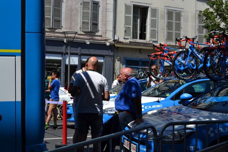 Het startdorp is volledig afgesloten, enkel toegankelijk voor badges en polsbandjes. We lopen rond het dorp en zien het startpodium aan de achterkant, en daar blijven we dan een tijdje. Vooraan is niks voor ons: veel te veel volk en lawaai in de blakende zon. We zitten op een stoeprand in de schaduw van de bomen en kijken toe.