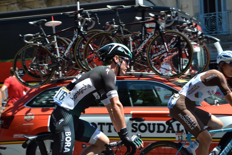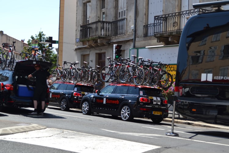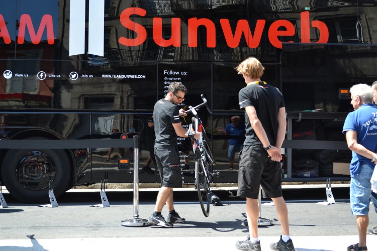 Maar alles achter dranghekkens: nergens kan je echt bij. Tot aan het eind van de afgezette zone: die is blijkbaar te klein, en niet alle bussen kunnen er staan. De bussen van Sunweb en Orica staan buiten de nadars, en daar gaan we dan ook even een kijkje nemen. Niet dat we renners lastigvallen, maar ’t is toch wel eens leuk echt dichtbij te zijn en renners, teamleiders en sportdirecteurs te zien.