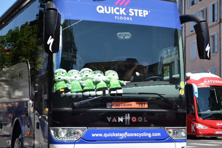 En de Quickstep Floors bus met de groene leeuwtjes van Kittel.