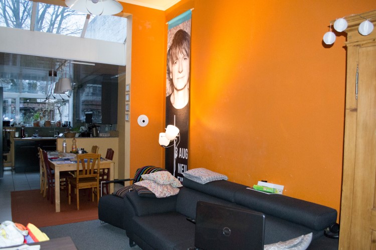 Een paar weken nadat ik ziek werd, kochten we (tijdens de Music for Life actie) een banner van de Lokerse Feesten, en die hangt nu prominent in de woonkamer. Ik vind het heel mooi passen, en niet overdreven of storend eigenlijk. Sedert dan kijkt Neil Finn ons huis in, vriendelijk en met een zachte glimlach. Een beetje bemoedigend zo. We hebben voor mooie verlichting gezorgd, en ik vind het fantastisch.