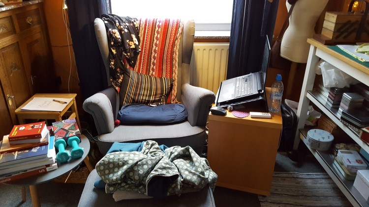 Mijn zetel, waarin ik omringd door al mijn spullen zit. Laptop, boeken, gewichtjes om mijn spieren wat te versterken, allerlei handwerkgerief. En over de leuning een kleedje dat ik kreeg van mijn schoondochter voor mijn verjaardag, dat ik ga vermaken tot een leuk zomerkleedje. (was expliciet daarvoor gekocht: het stofje is zalig, het model minder en te groot. Gekregen om om te bouwen tot een fijn zomerkleedje).