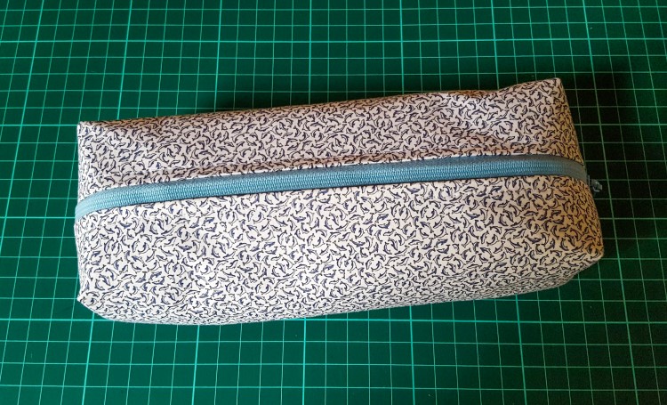 Lies mocht voor zichzelf ook nog stofjes kiezen om een pennenzak mee te maken. Ze koos voor een stofje dat ik eerder voor een kleedje voor Lili gebruikte, met heel kleine dolfijntjes. Langs de binnenkant een witte stof met witte bolletjes.