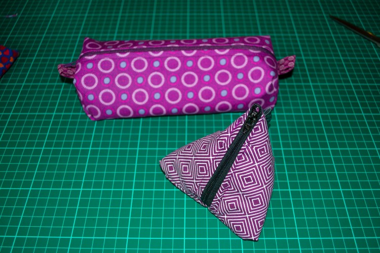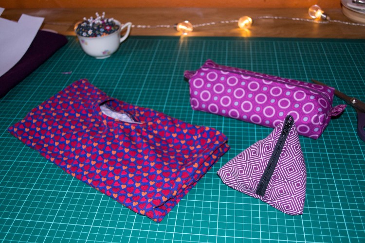Het werden zakjes in haar lievelingskleur: paars. Een driehoekje en een pennenzak (gevuld met stiften en potloden).