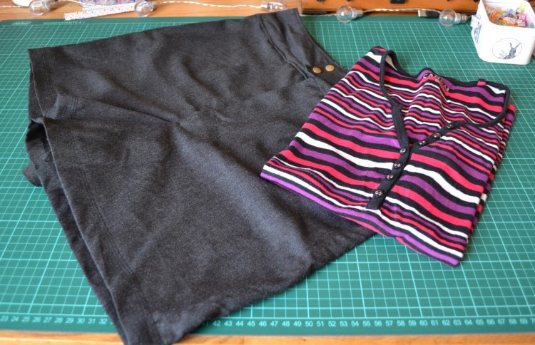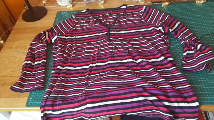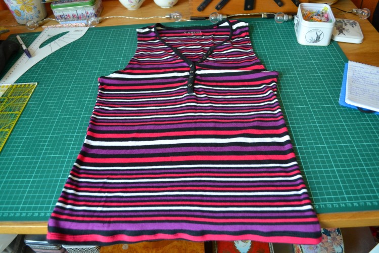 Ik verbouwde dit shirt dus naar een mouwloos shirtje. De halslijn bewaarde ik, ik knipte er de mouwen en een stuk zijkant af, en werkte de naden af met de coverlock. Upcycling to the max, mooi resultaat, al zeg ik het zelf!