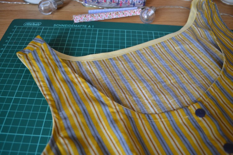 Het patroon maakt gebruik van biais-band om de halslijn en armsgaten af te werken. Waar ik er vroeger een hekel aan had slash doodsbenauwd van was omdat ik er niks van bakte, begint dit stilaan toch te lukken.