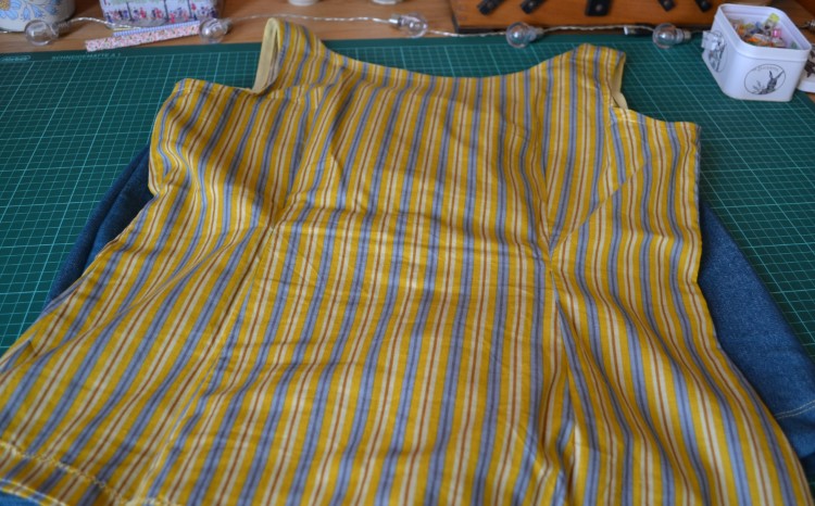 Later bestelde ik bij Driessen Stoffen een verrassingspakket, wat me erg goed meeviel. Leuke stofjes. Daartussen zat een stuk jeansstof in een erg mooie kleur (blauw, maar met een zweempje groen) met een lichte stretch erin. Ook in het pakket, een blauw-geel gestreept katoentje dat daar perfect bij paste. De belletjes gingen meteen aan het rinkelen in mijn hoofd: een Weston short in de jeansstof, en een topje zonder mouwen erbij in de het streepjeskatoen. Behoorlijk buiten mijn comfort zone wat kleuren betreft, maar ik zag het helemaal zitten en was ongeduldig om eraan te beginnen.