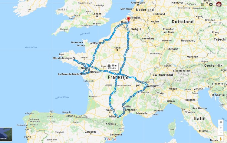 Het kaartje geeft ruwweg aan waar we naartoe gaan, maar is zeker niet helemaal accuraat. Deze keer maken we ook echt omzwervingen in Frankrijk, een rondreis valt het niet te noemen, als je naar dit kaartje kijkt.