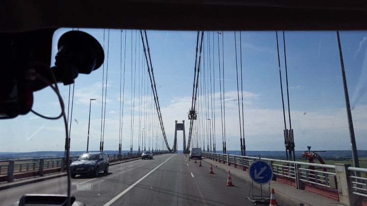 We rijden naar de brug van Tancarville, een mooie grote brug over de Seine. (op de foto zie je hoeveel insecten zich te pletter vlogen tegen het raam, op een bepaald moment leek het alsof het regende, maar het waren hordes insecten die collectief zelfmoord pleegden)