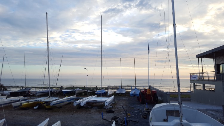 Deze keer geen bareel in zicht, en we vertrekken probleem- en geruisloos. We hebben ongeveer 250 kilometer voor de boeg. We stoppen een eerste keer aan de kust in Langrune-sur-Mer, waar we een prachtige ochtendlucht in pastelkleuren kunnen bewonderen. We eten er ons ontbijt, en vertrekken weer.