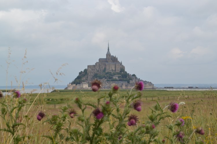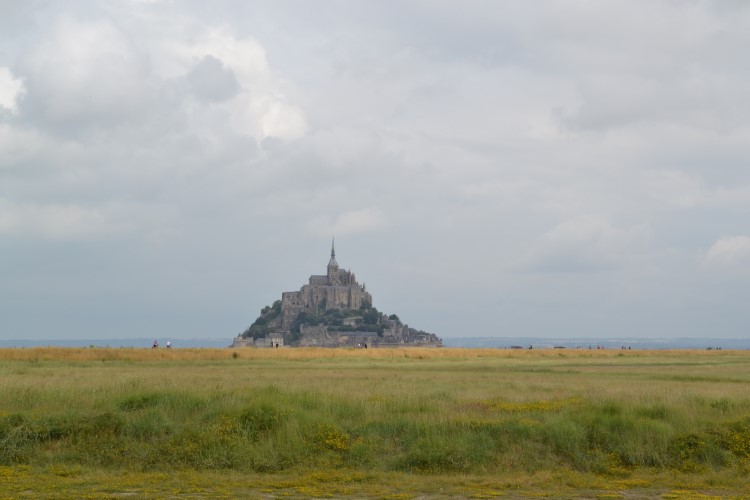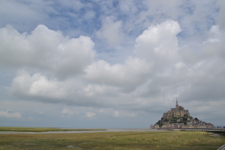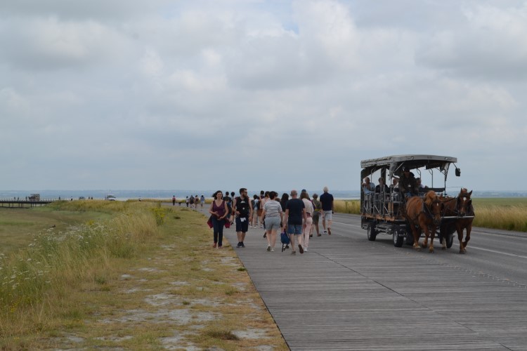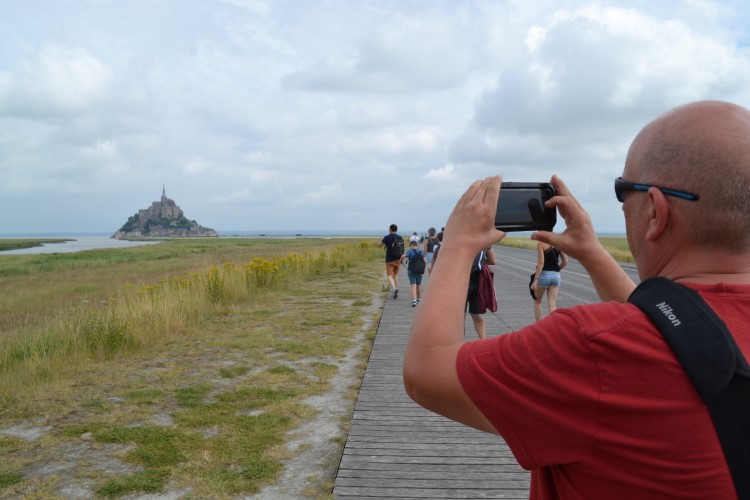 We stoppen in Domjean voor inkopen bij de bakker, en wat later tanken we bij een lokaal klein tankstation. Waarna we koers zetten naar de Mont-Saint-Michel. We rijden er grandioos verkeerd in Avranches, maar geraken verder zonder al te veel problemen op de parking van de Mont Saint-Michel. Een gigantische parking. Met ruimte voor campers. Wel ontzettend duur: 17,6 euro voor 24 uur. We blijven er lang geen 24 uur, maar betalen toch de volle pot. Hadden we dat geweten, we zien achteraf behoorlijk valabele alternatieven. Ach ja. We laten het maar achter ons en bewonderen het mooie landschap met de spectaculaire Mont-Saint-Michel. We gaan te voet tot aan het begin van de getijdenbrug, waar we terugkeren. Zoals gepland, we hebben geen zin in de overbevolkte straatjes op de Mont Saint-Michel zelf.