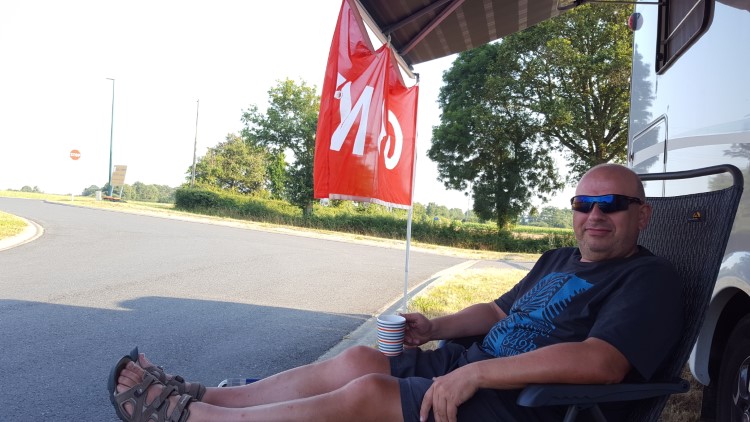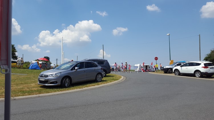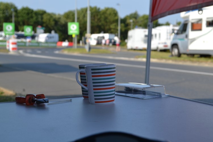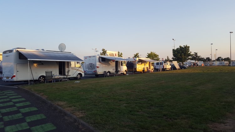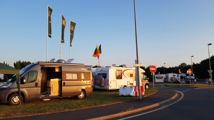 Plan is om meteen op het parcours te gaan staan. Wim en Riet, een Nederlands koppel dat we vorig jaar ontmoetten en waar we nu weer mee afgesproken hebben, zijn al ter plaatse. Op de parking van de MacDonalds richting Cholet, dus rijden we daarheen. Onderweg stoppen we nog om te lozen in Vieillevigne. Dat van die parking van de MacDonalds had ik niet goed begrepen, we staan aan de MacDonalds in Cholet (op het parcours) en zien daar niemand die we kennen. Blijkt dat er in Saint-André-de-la-Marche ook een MacDonalds is, en staan ze daar. Ah ja. Wij daarheen. We vinden hen nu wel vlot, en gaan tussen hen en een food truck staan. De man van de food truck verwittigt ons dat de generator de hele nacht gaat draaien, maar dat moet dan maar. We halen iets te eten in de MacDonalds (over het aanbod van de food truck moeten we nog een nadenken), maken nog een wandeling in camperland (lichtjes hallucinant) en kruipen in ons bed.