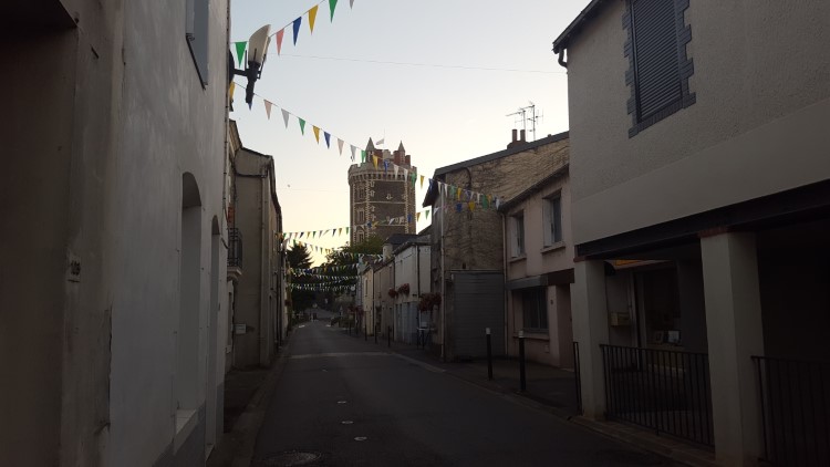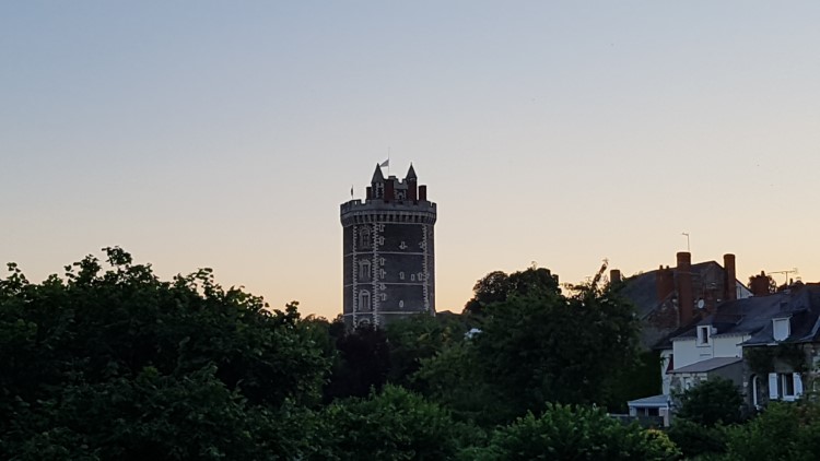 We rijden weer naar beneden, in het stadje ervoor (Oudon, met een prachtige toren van een middeleeuws kasteel, en een kerk) hebben we een paar mogelijkheden gezien. We rijden er naar een camping, maar daar kunnen we niet meer binnen, we zijn een half uur te laat. Dan rijden we maar naar de plaats waar we mobilhomes hebben zien staan, op een goeie kilometer van de camping. Dat blijkt een parking te zijn die meer op een park lijkt, campers mogen er eigenlijk niet staan, maar er staan er zeker al 5, dus we stellen er ons maar bij. We eten iets en maken nog een korte wandeling in het idyllische stadje, bij zonsondergang nog mooier met de zachte kleuren.