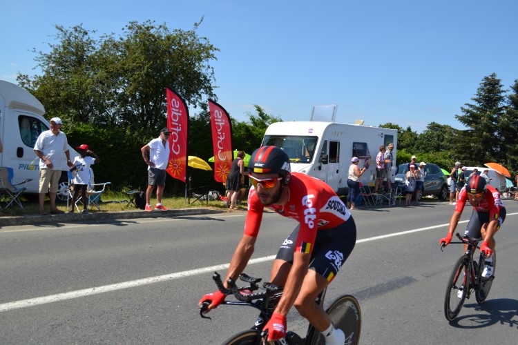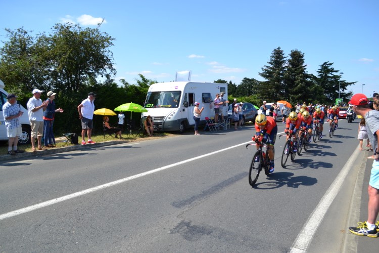 Pizza halen bij een kraampje. Wachten. Er zit al snel veel volk aan de kant van de weg, met stoeltjes en frigoboxen en parasollen. Mensen zijn soms behoorlijk onbeschoft, en het is toch wel constant alles in de gaten houden. Aan onze mobilhome komen mensen met een baby zitten, Uiteindelijk laten we hen in de schaduw van de luifel zitten, ze hebben niet veel mee om het kind tegen de brandende zon te beschermen. We gaan langs de kant van de weg zitten voor de publiciteitskaravaan, maar laten die ook nu aan ons passeren. We hoeven geen “cadeau’s”. Het is druk, het is hectisch. En het zotte is dat er enorm veel mensen verdwijnen als de koers passeert, en het dan veel rustiger en aangenamer is. Een tijdrit langs de kant van de weg volgen is leuk, je ziet uren aan een stuk met regelmaat een stelletje renners passeren. Een ploegentijdrit is korter, maar toch behoorlijk spectaculair. We nemen nu wel stapels foto’s, maar er nu door waden om er goeie uit te halen is een te langdurige klus. Ik zocht er een paar uit.