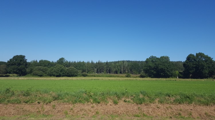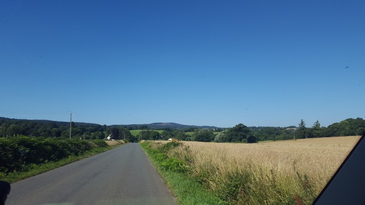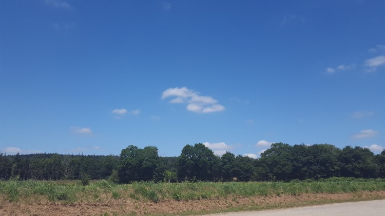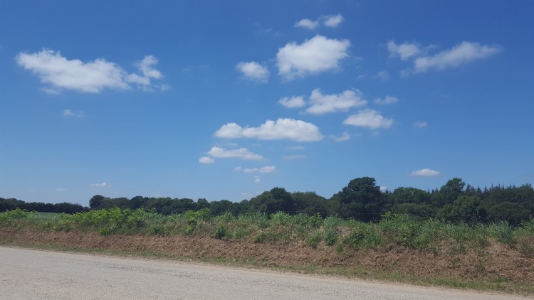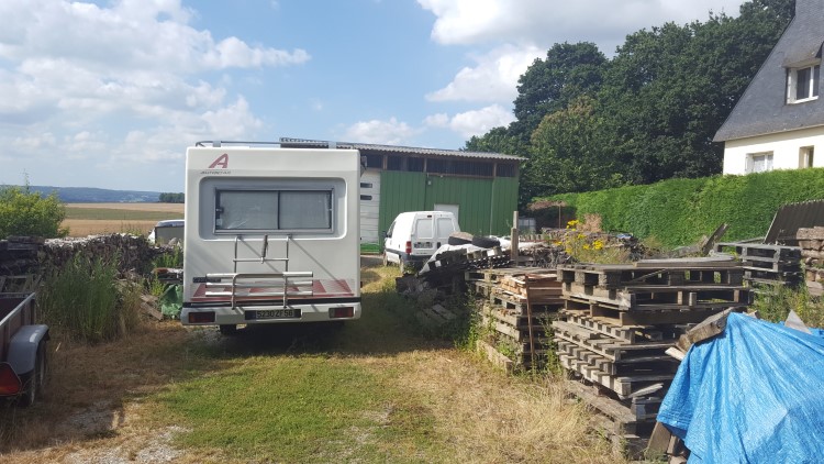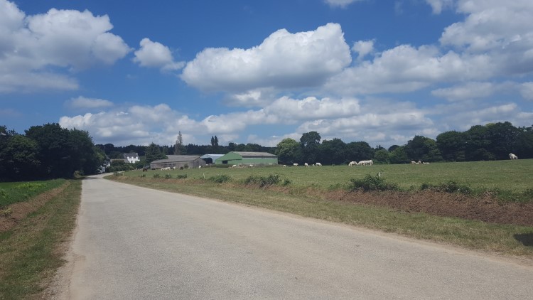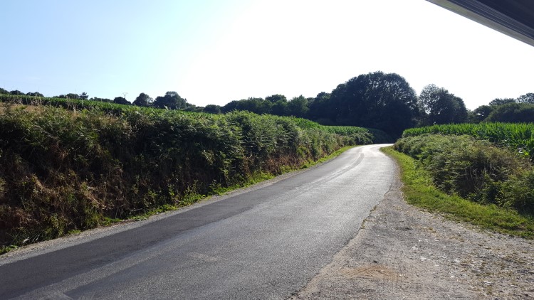 Langs een Carrefour Market voor de benzinepomp ernaast. Vanuit Gourin het parcours op, om op het gemak wat te tuffen tot we een mooi plaatsje vinden. Wat we vinden na Saint-Gouazec en voor Mendy, op een strook waar nog andere campers staan, maar afgelegen genoeg zodat er geen mensen te voet komen. Weer een heel rustig plaatsje, met weiden en koeien en mooie blauwe lucht die zich langzamerhand vult met wolken.