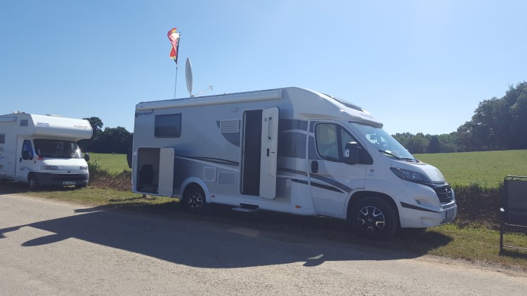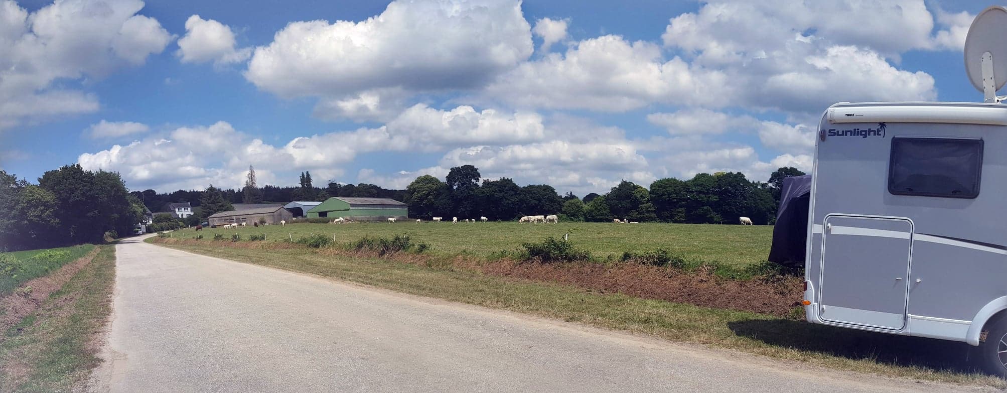 Onze eis van de dag: geen volk! Dus: geen dorp, geen plein, geen kruispunt, geen rotonde, geen huizen. En na een tijd rijden vinden we zo’n plekje net voorbij Caden. We zitten in Bretagne (de Morbihan meerbepaald) en alle plaatsnamen staan dubbel op de verkeersborden. Caden is ook Kaden. Alleen velden rond ons, en geen mensen. Heerlijk. We laten Wim en Riet weten waar we staan, en zij komen ook af, er is plaats voor 2 campers.
