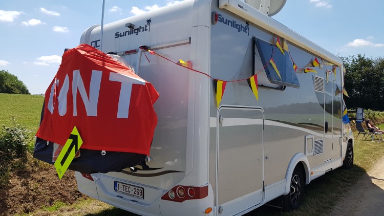 De publiciteitskaravaan passeert zoals verwacht aan een noodvaart, het is af en toe de vliegende projectielen ontwijken. Dan weer een uurtje wachten op de renners, ondertussen kijken we TV. We hebben een deel van het parcours afgereden, en ik herken hier en daar wel iets. Als de 4 kopliggers passeren, gooit één van hen een bidon. Die belandt onder de mobilhome. Eén van de Franse jongens komt aangelopen om de bidon in te pikken. Maar dat is zonder Wim gerekend, die duikt onder onze mobilhome en geeft de bidon aan Meneertje Mertens. Het is vooral het principe dat telt (en dat vinden wij ook wel).