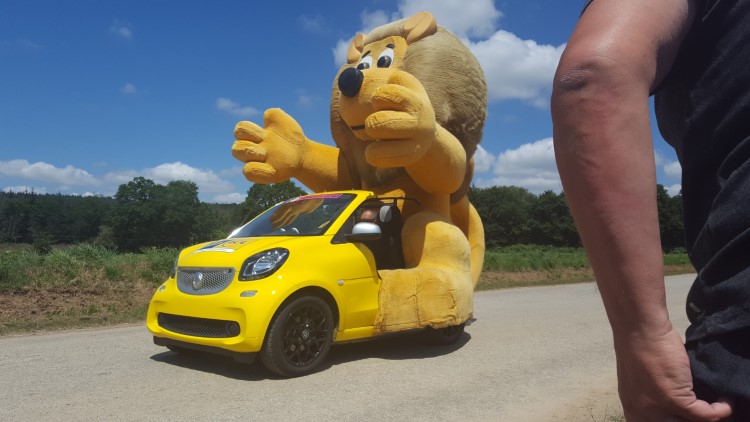 We eten een boterhammetje, en lummelen maar wat aan. Stilaan beginnen er meer wagens te passeren, ze rijden allemaal aan een behoorlijke rotvaart. We worden een beetje nerveus als we denken aan welke rotvaart dat peloton hier voorbij gaat razen. We krijgen enkel nog het gezelschap van een Franse papa met zijn zoons wat verderop, verder komt er niemand. Een verademing na de vorige dagen! We horen wel dat in elke bocht wel iemand staat. Onze Belgische vlag lokt enorm veel reacties uit, zowel van Fransen (allez les Bleus! On va gagner!) als Belgen die toeteren en zwaaien. Uit de volgauto’s komt vandaag veel meer reactie dan anders.