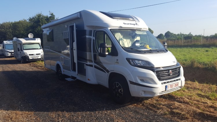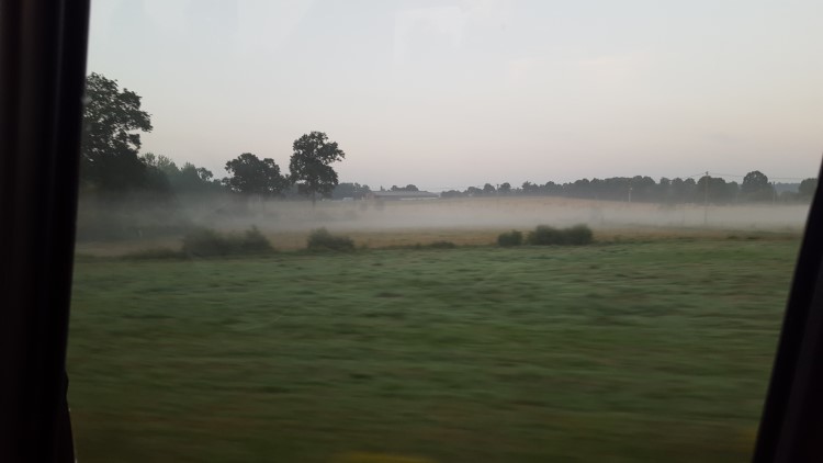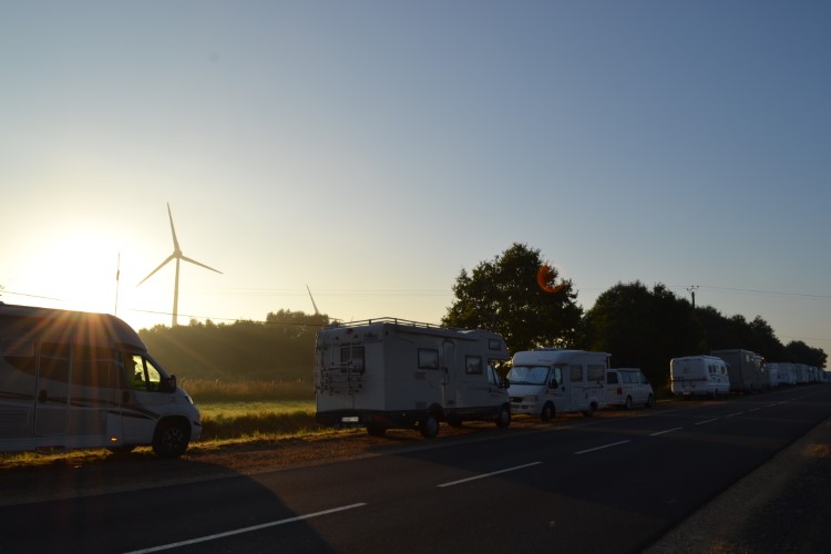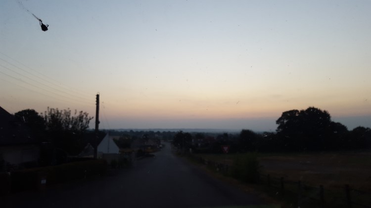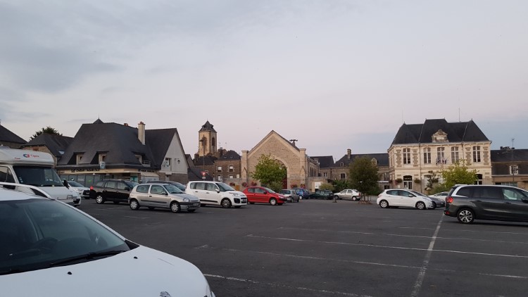 De volgende plaats op het parcours is 200 kilometer verder, en dat is sowieso niet haalbaar, denk ik. Meneertje Mertens wil zo ver rijden als hij kan, rijden tot hij te moe wordt dus. Maar eerst gaan we nog lozen op een serviceplaats een tiental kilometer verderop. De ergerlijke TomTom stuurt ons weer via de autosnelweg (hoewel “geen snelwegen” manifest aangevinkt staat, is dat blijkbaar niet duidelijk genoeg, en na een halve kilometer rijden is het al van dat), wat enig gerommel in de cabine veroorzaakt. Voor het servicepunt zitten we eerst fout en belanden we op iemand zijn privédomein, we worden er zowat afgejaagd met het France equivalent van “VAN MIJN ERF!!”, oeps. We vinden dan toch waar we moeten zijn. Dan rijden we verder richting Fougères. Meneertje Mertens voelt zich kiplekker en we rijden tot zonsondergang, en gaan dan op een plein in Saint-Aubin-sur-Cormier staan. We kruipen snel in ons bed.