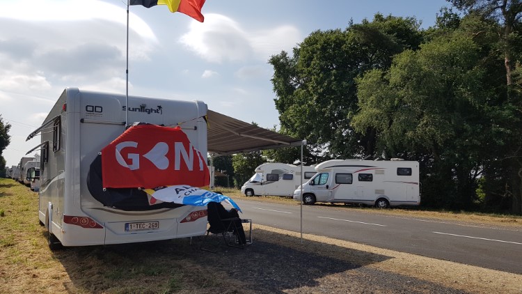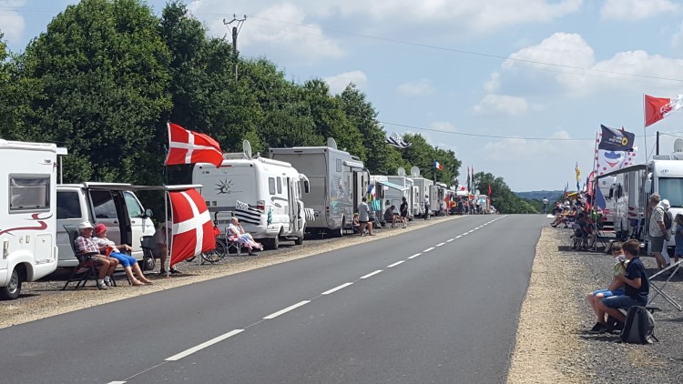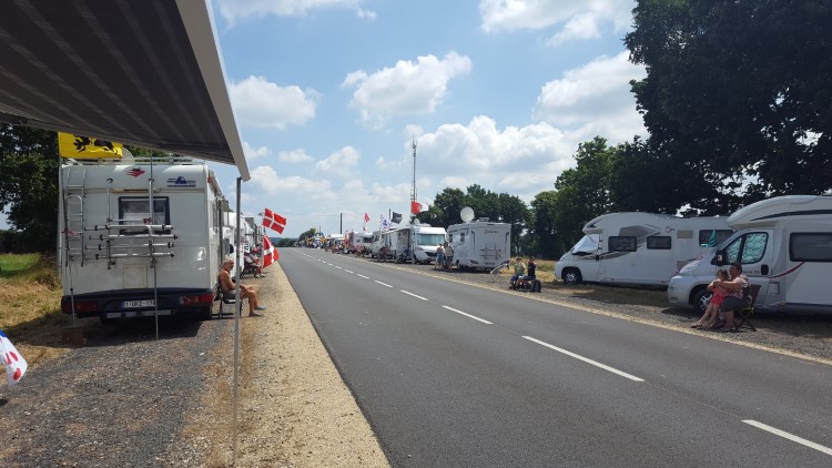 We maken eten klaar, rusten wat, laten de publiciteitskaravaan helemaal aan ons voorbijgaan terwijl we op bed liggen), en gaan dan op onze stoeltjes langs de kant zitten.