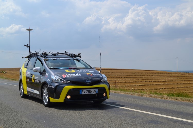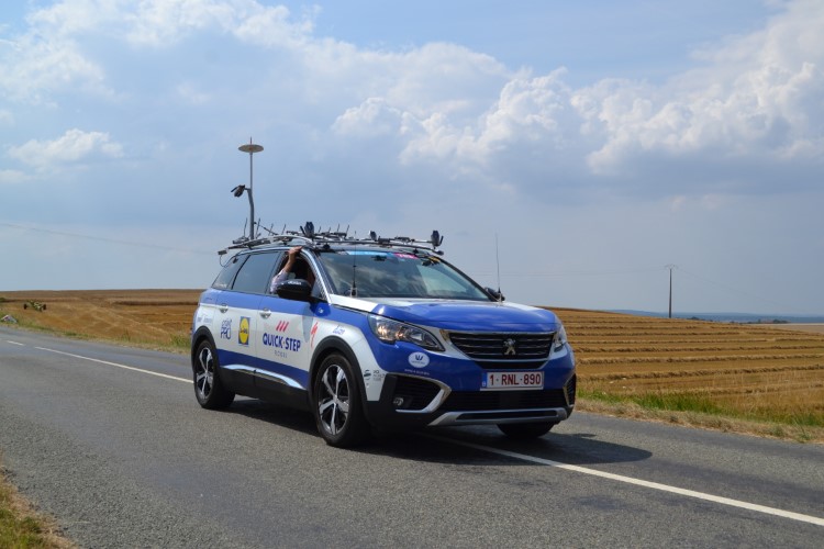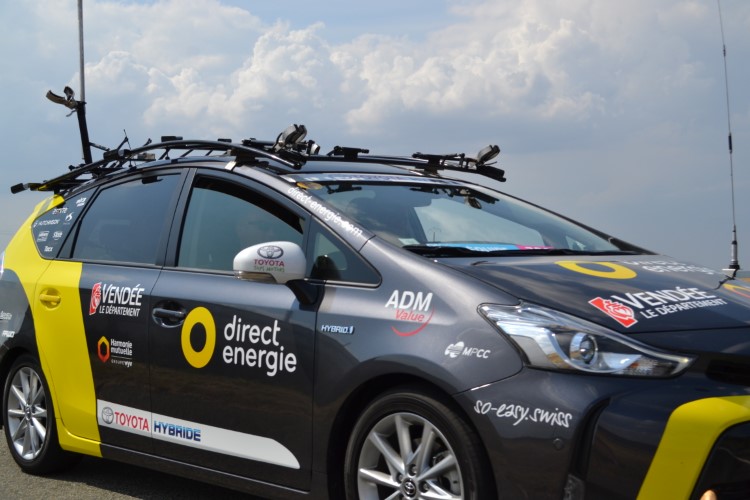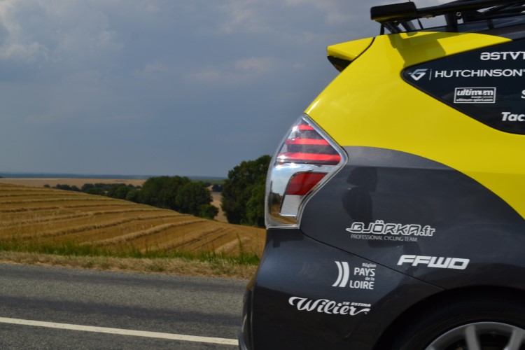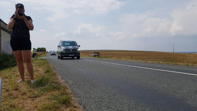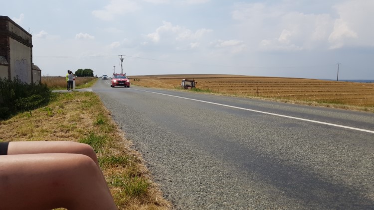 De voorpost passeert (Pichon) en daarna de renners in een aaneengesloten pak. Dat wordt weer een spurt vandaag. We ruimen ons boeltje op, keren aan het eind van het doodlopend weggetje (we hadden dus niet veel anders gekunnen dan daar blijven staan, haha) en vertrekken naar Piacé.