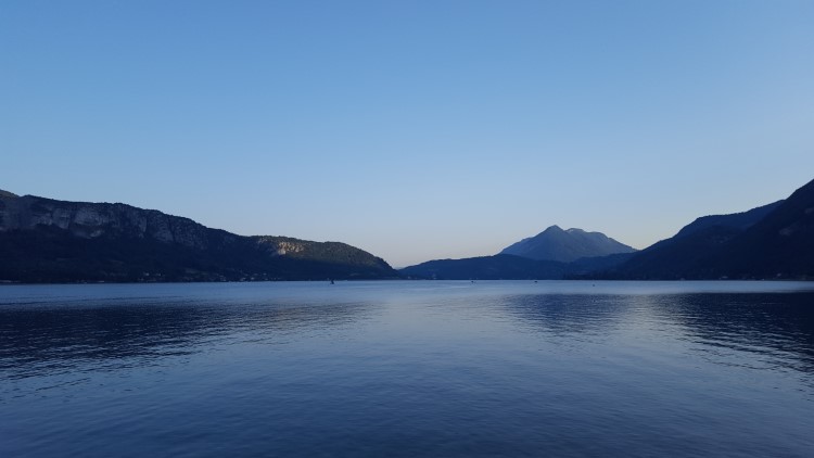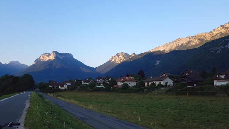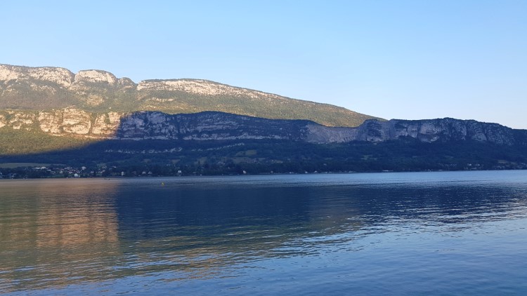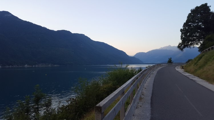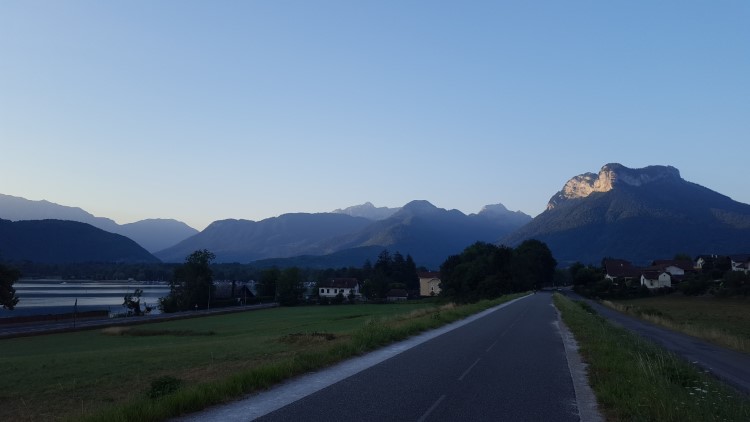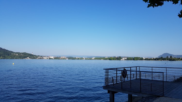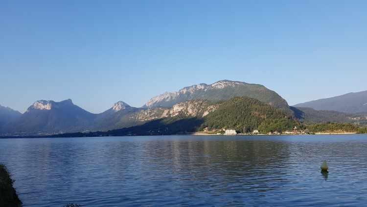 Daar gaan we de grote baan onder, en rijden we via het fietspad naar de andere kant van het meer. Ik had gelezen dat daar geen fietspad is en dat je via de grote weg terug naar Annecy moet. En echt leuk is dat niet, de auto’s en vrachtwagens razen je voorbij. Maar, de info was al wat verouderd blijkbaar, want na een kilometer of 3 of 4 (ik heb niet opgelet hoe lang het was), is er opeens weer een dubbel, gescheiden fietspad en kan je weer veilig verder. Wat een opluchting. Ook hier is het mooi fietsen, soms echt vlak naast het meer. Er is ook een lang stuk op een parallelweggetje naast de grote weg.