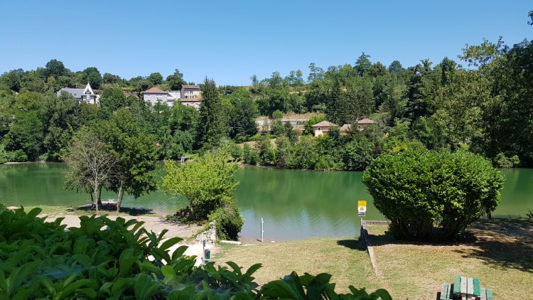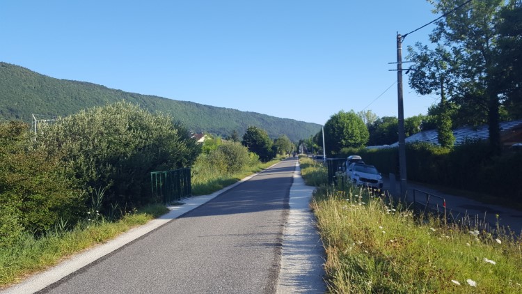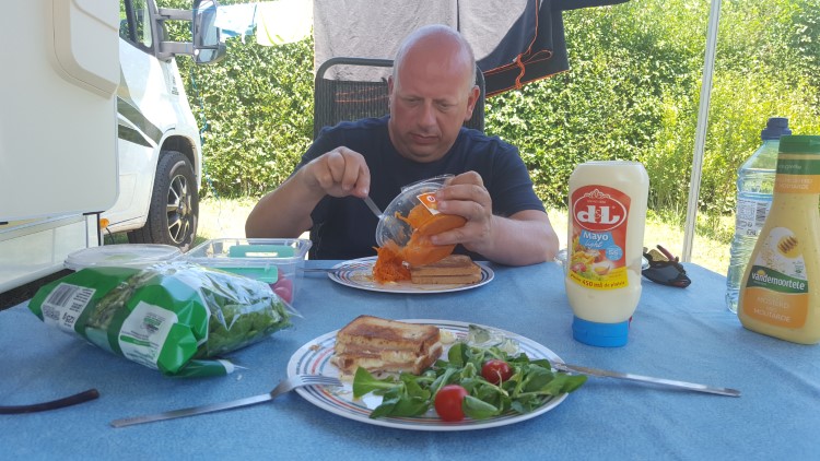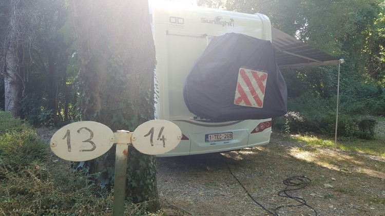 De nacht was iets minder paradijselijk. In tegenstelling tot de vorige keer waren we wat minder tevreden over deze camping: vooral veel te veel lawaai. Onze buren aan de achterkant van de camper vertrekken morgen ook, en brengen uren door met opruimen. Om 23u zijn ze nog steeds bezig, met veel lawaai. Onze buren aan de voorkant van de camper werken al langer op onze zenuwen. Vanavond opnieuw: ze blijven maar kletsen. Rond 23u begint het ook te onweren en krijgen we een stortbui over onze kop. De ene kant buren blijft kweppen, de andere kant blijft lawaaierig opruimen met veel gedoe met de deuren van hun campervan, de regen klettert en het dondert… een goede nachtrust is ons niet echt gegund. Maar goed. Straks zijn we hier weg. Om 5u beginnen we dan maar zelf lawaai te maken, om de onnozelaars die nu slapen wat te ambeteren. Niet echt, we zijn daar niet goed in, en proberen alles toch zo stilletjes mogelijk te doen. We gaan koeken en brood halen in het winkeltje op de camping, we gaan lozen bij het vertrekken, en na nog 2 afscheidsfoto’s van de Voie Verte zijn we echt weg.
