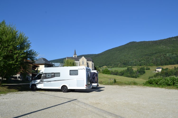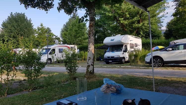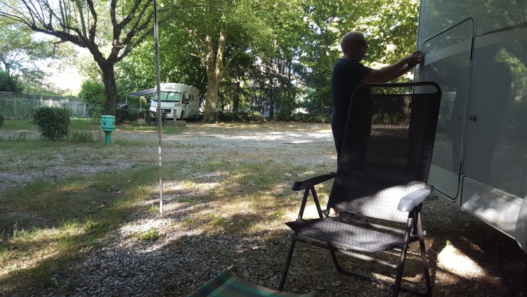 De camperplaats is weer heel rustig, er staan campers maar er is nog behoorlijk veel plaats. We twijfelen over het plaatsje dat we zullen bezetten. Uiteindelijk gaan we in de zon staan met de snuit van de camper in de schaduw, we willen namelijk naar de koers kijken (Alpe d’Huez!). Het is goed te doen binnen doordat de camper met de cabine in de schaduw staat. Na de koers verzetten we de camper naar een meer schaduwrijke plaats en zitten we op ons gemak wat buiten. We verkennen de camperplaats eens, opnieuw is het een gesloten camping waar het sanitair afgesloten is, en voorzieningen geplaatst zijn voor campers. Sommige mensen vinden dit maar niks (versleten, weinig voorzieningen), wij hebben het wel voor deze vergane glorie. En ondertussen worden deze leegstaande plekken toch maar weer gebruikt.