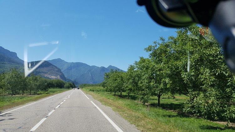 We rijden door Chambéry (mooie stad) en dan gaat het via grotere wegen naar Grenoble. Daarna zoeken we de Isère op, en gaat het kilometerslang via het parcours van de rit van morgen via de rivier. Ik vind het landschap toch minder mooi dan in de bergen. Na het graan en de wijn, zijn het nu de noten. Kilometerslang: notelaarboomgaarden.