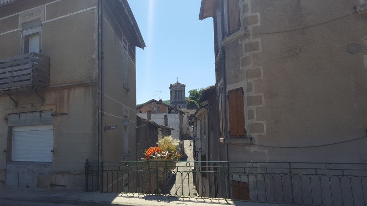 Ik wist ook dat het in een dorp klimmen zou zijn, en die klimmetjes doe ik grotendeels te voet. Ik heb er de fiets niet naar om die al fietsend een berg over te sleuren. En het is bij momenten behoorlijk pittig, in een haarspeldbocht die ik de koersfietsers ook aan 9km/u vooruit sukkelen. Het is trouwens de berg waarop de eerste bergrit van de Tour startte. Alleen gingen zij verder op de Col de Bluffy en hoeven wij dat gelukkig niet te doen.