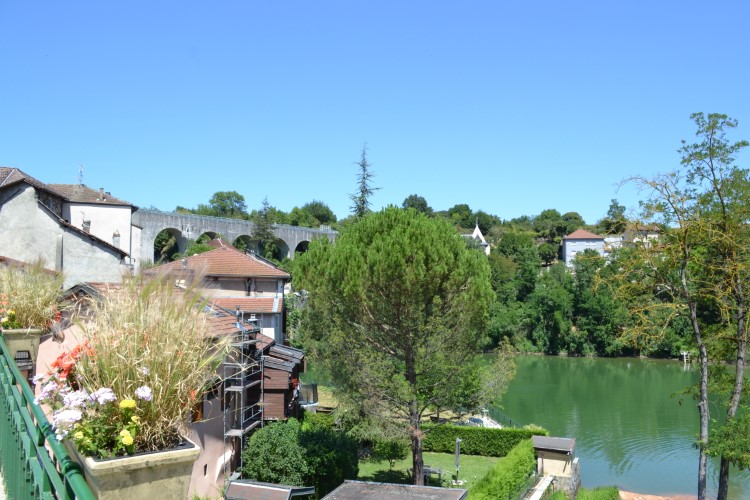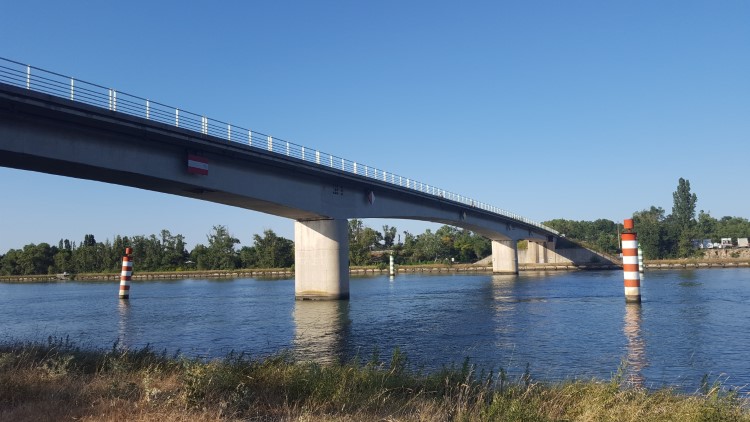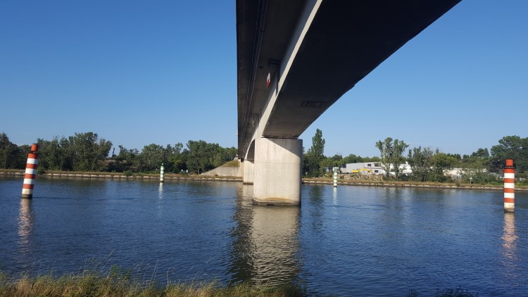 We besluiten naar het water te trekken en in het terugkeren pizza te halen. Wat het weer betreft doen we dat te vroeg, we hadden beter rond 20u op stap geweest. Het is heet in de zon. Eerst denken we nog even dat we niet aan het water gaan raken, maar het lukt toch. De Rhône is breed en imposant. We staan alweer onder een brug. Dit is de reis der bruggen!