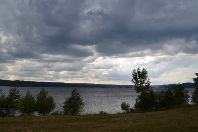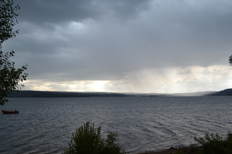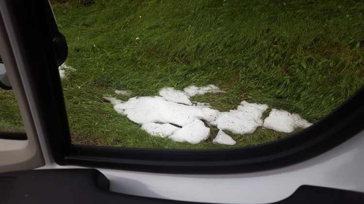 Komt ook niks van in huis (die hamburger bedoel ik, misschien ben je dat al vergeten na bovenstaande foto’s): dat kan pas vanaf 19u. Hm. Hadden we beter toch ’s namiddags iets gegeten. Ik eet een heerlijke pannenkoek met karamel en beurre salée ter compensatie, Meneertje Mertens een ijs. We rennen door het beginnend onweer terug naar de camperplaats. Zie je het al regenen in de verte?