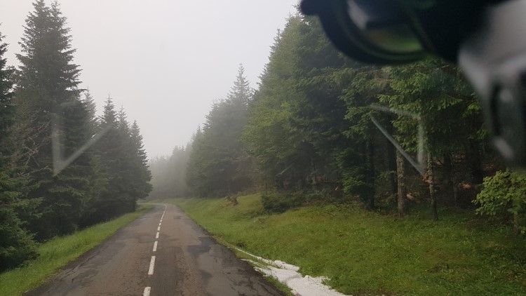 We rijden in de zon, maar zien een grote dikke wolk voor ons, en rijden er recht in. En we blijven ook in deze wolk.