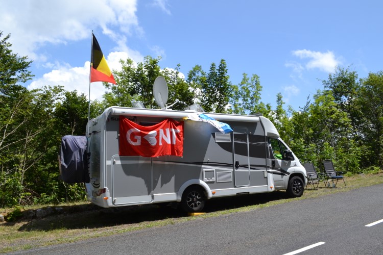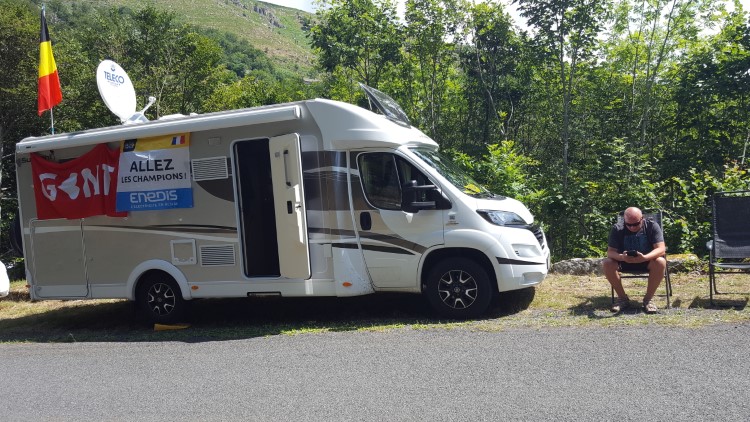 Ergens in de loop van de middag passeert een groep jonge gasten met een boombox, ik krijg het op mijn zenuwen van de luide en irritante muziek, gelukkig lopen ze verder de berg op. Er zitten enorm veel Hollanders in onze omgeving, allemaal komende van campings in de buurt, nemen we aan. Er is nog altijd veel commentaar op de Belgische vlag. De Britse jongens naast ons met een camper met Franse nummerplaat zetten na de publiciteitskaravaan lekker luid een album van Led Zeppelin op, dat vind ik wel leuk. Kijken naar de passerende auto’s met No Quarter als achtergrondmuziek, ik kan het wel pruimen.
