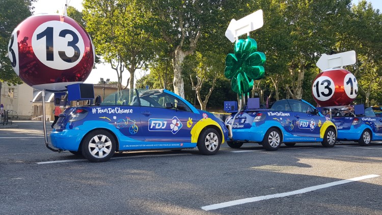 Daarna gaan we naar de omgeving van de promenade Barbès en waar het tourdorp is, en belanden we zo op de promenade du Canal waar de publiciteitskaravaan vertrekt. We zetten ons op een muurtje en kijken toe hoe dat gaat, het verzamelen van de auto’s, het aankomen van het werkvolk, de chauffeurs, de hostessen, de jobstudenten, de vips, enzovoort.