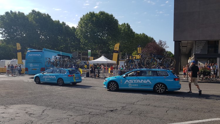 De bedrijvigheid daar is leuk om te zien: de bussen, waar techniekers bezig zijn, iemand de was doet enzovoort. Er staan ook allerlei andere tour-auto’s geparkeerd. We zijn erg vroeg, en gaan Carcassonne eens verkennen. Dat doen we heel summier, we zien de kathedraal en de versterkte binnenstad van ver, maar we hebben toch ook genoten van de sfeer.