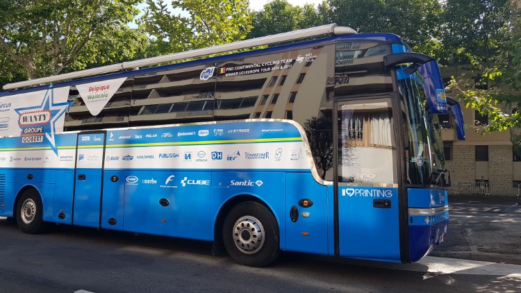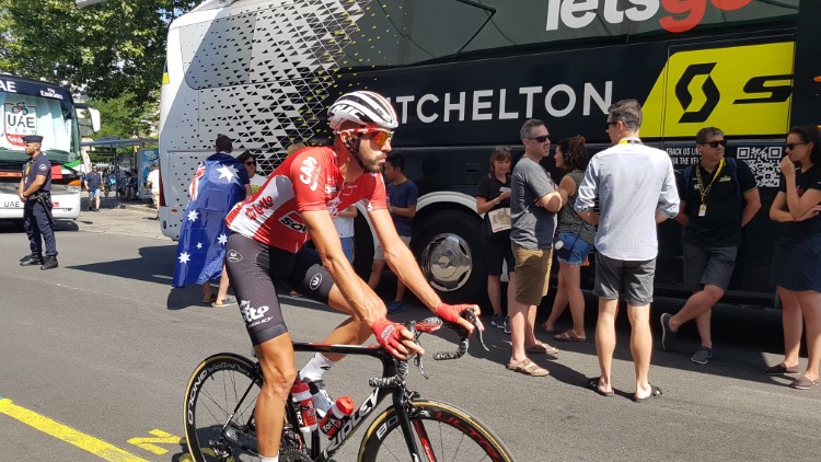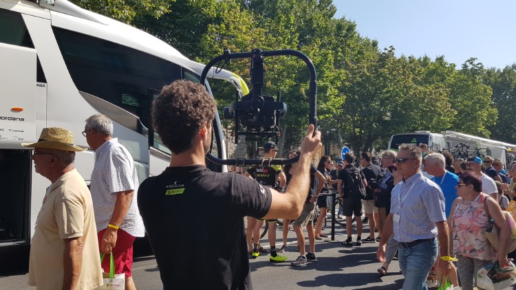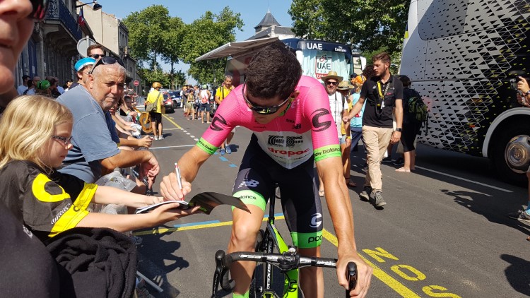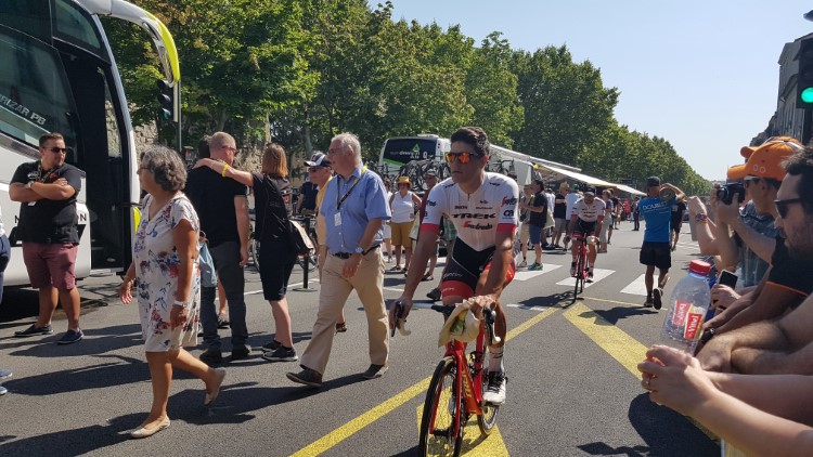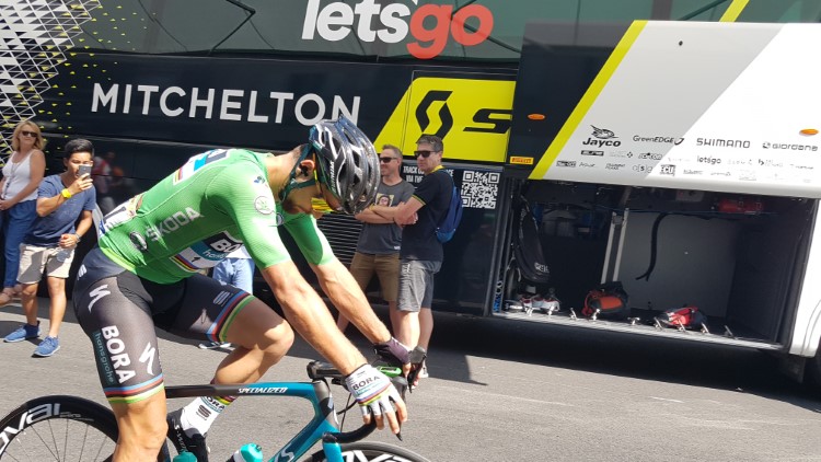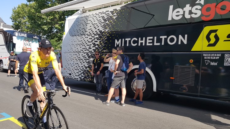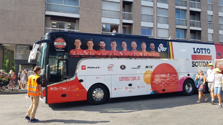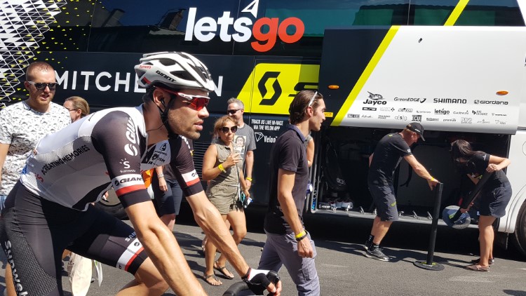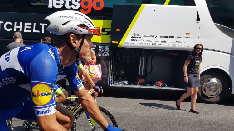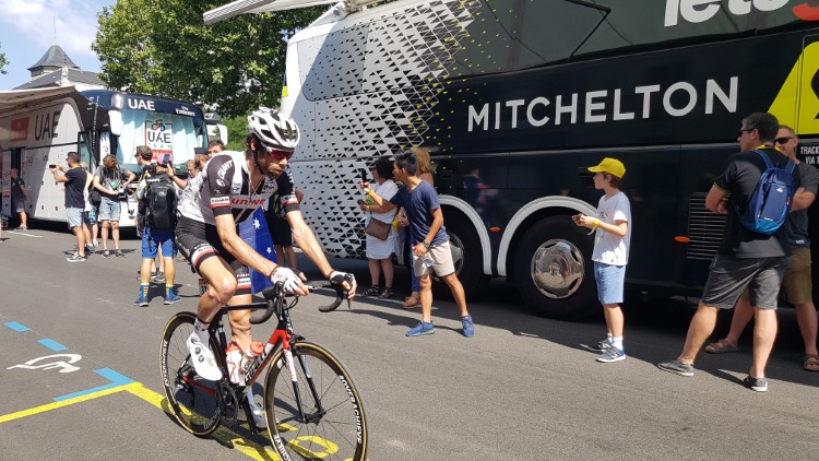 We trekken verder en houden halt aan de bus van team Mitchelton Scott. Daar blijven we ook en kijken naar de bedrijvigheid: we zien Maarten van Gramberen die een reportage maakt voor Vive le Velo, we zien heel veel renners passeren die gaan tekenen en dan terugkeren, en later nog eens terugkeren naar de start, we zien de ploegwagens vertrekken, we zien Dumoulin, Peter Sagan, Simon Gerrans, Chris Froome, heel veel andere renners, ook Jelle Vanendert en Thomas Degendt, naar wie ik “succes Jelle” en “succes Thomas” roep, en die reageren daar begot zelfs op. We zien Hilaire Vanderschueren, Patrick Lefevere, Dikkopje zien we verschillende keren, Kwak en Boemel (u mag zelf raden wie we met deze bijnamen bedacht hebben, in de loop van de afgelopen weken), en bij de bus van Mitchelton zien we natuurlijk veel van hun renners en stafleden van de ploeg.